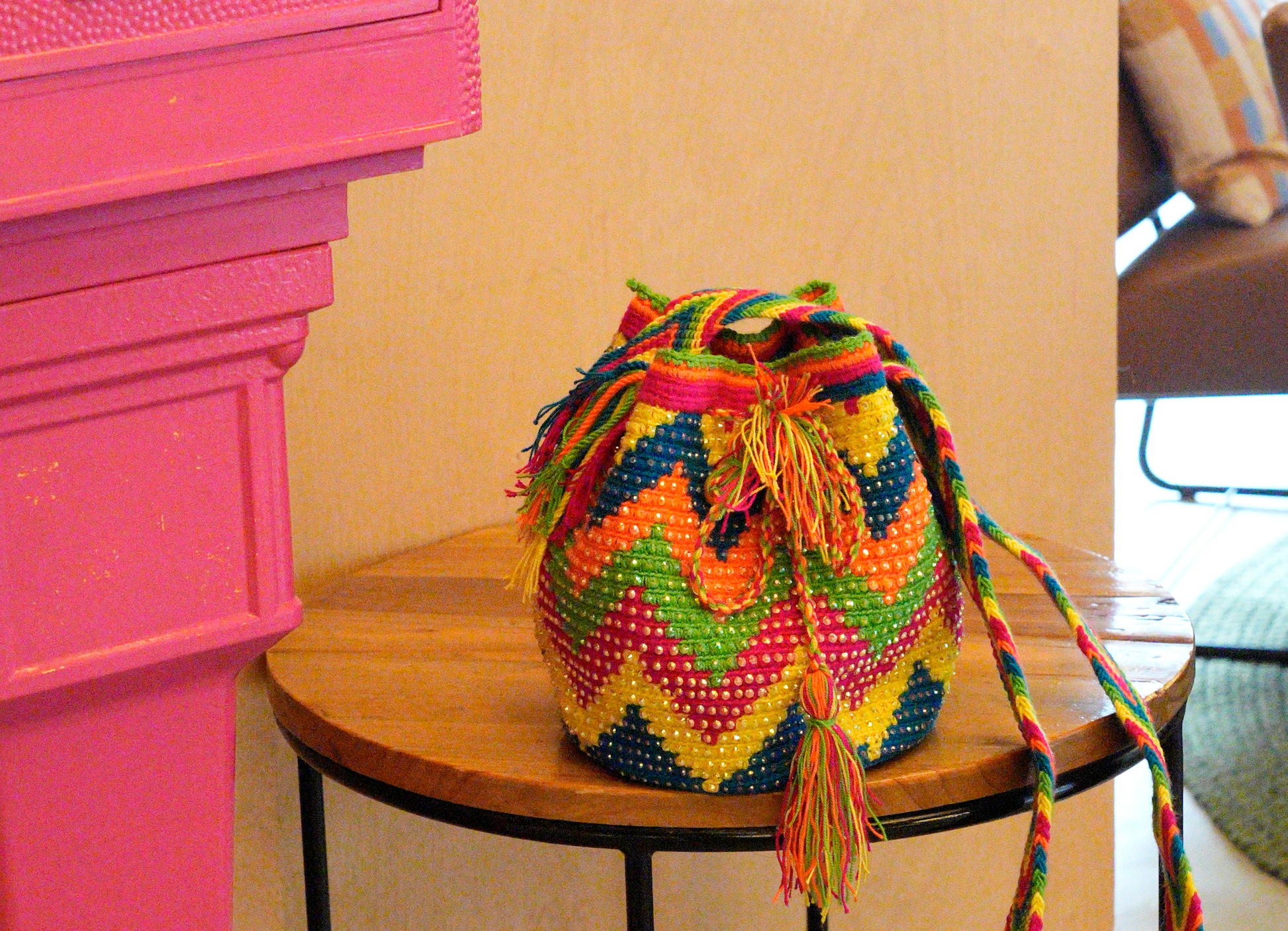 Sac colombien wayuu tissé avec des fils de couleurs vives (fuchsia, bleu, orange, jaune, vert) et des détails en strass. Une explosion d'énergie et de couleurs.